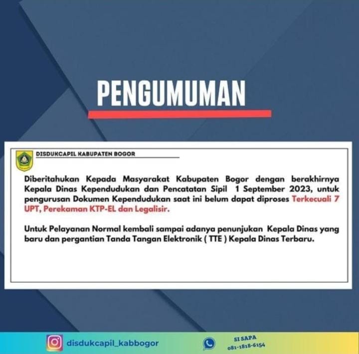 “Maaf kepada masyarakat Kabupaten Bogor dengan berakhirnya Kepala Dinas Kependudukan dan Pencatatan Sipil 1 September 2023, untuk pengurusan dokumentasi kependudukan belum bisa diproses,” dikutip dari akun resmi Disdukcapil Kabupaten Bogor, Kamis 31 Agustus 2023.