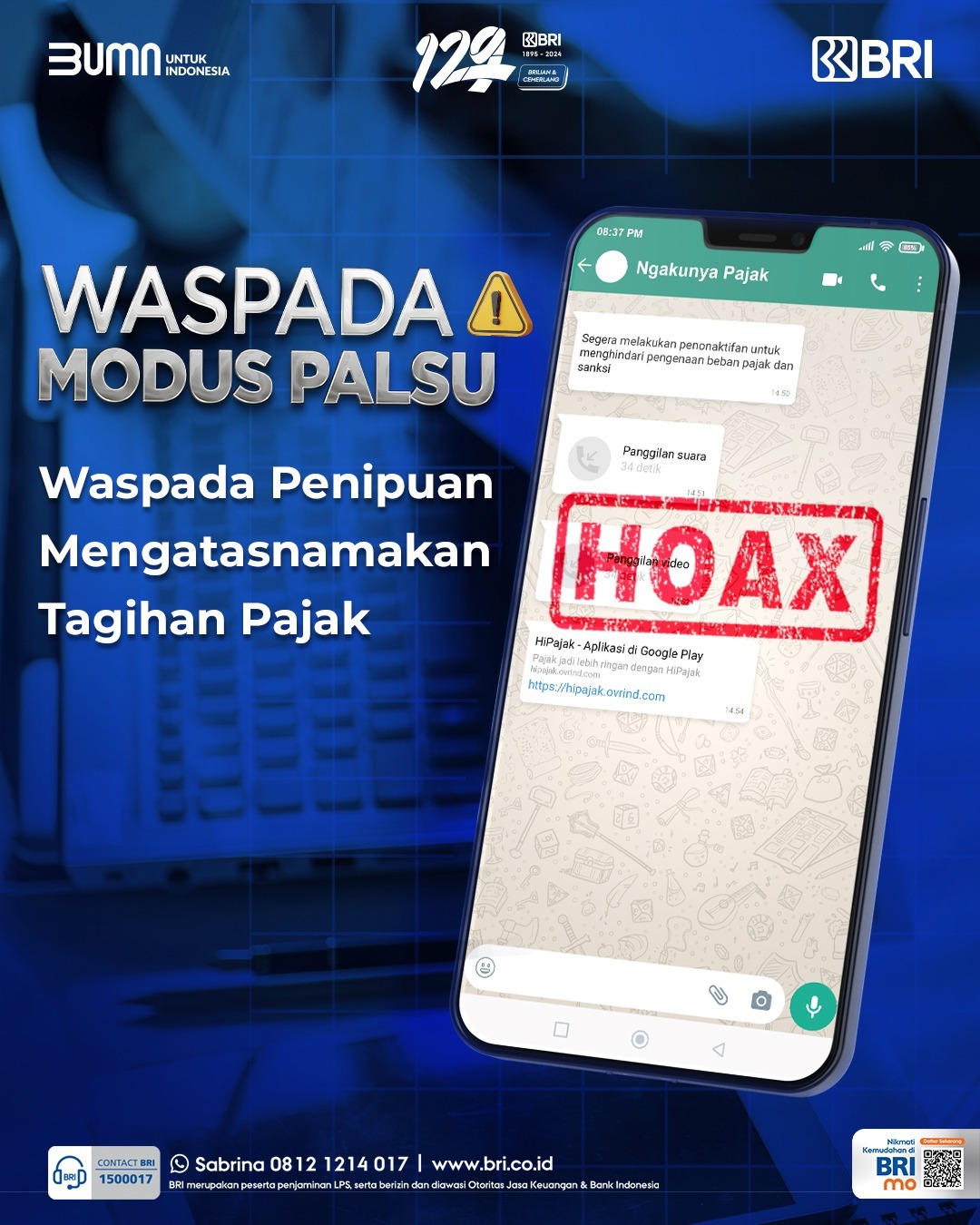 Waspadai pesan atau email mencurigakan yang mengatasnamakan BRI atau lembaga resmi lainnya. Verifikasi keabsahannya melalui call center resmi.