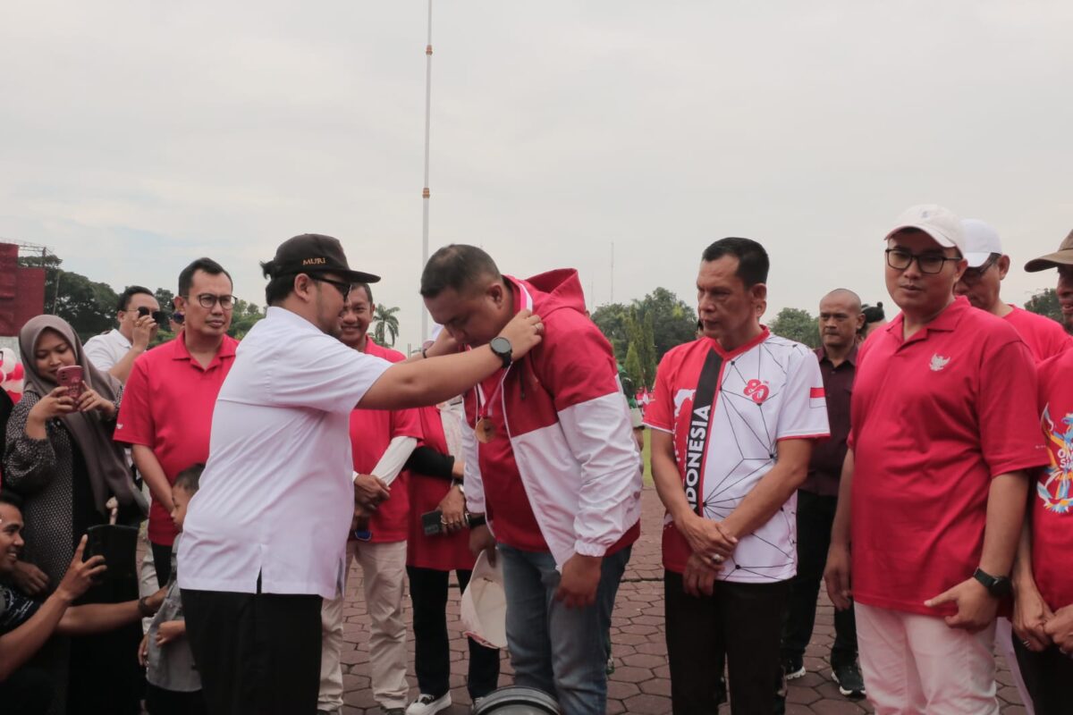 Talas kukus itu kemudian diberikan kepada ribuan peserta yang mengikuti kirab merah putih yang dilangsungkan dari Stadion Pakansari hingga lapangan Tegar beriman.