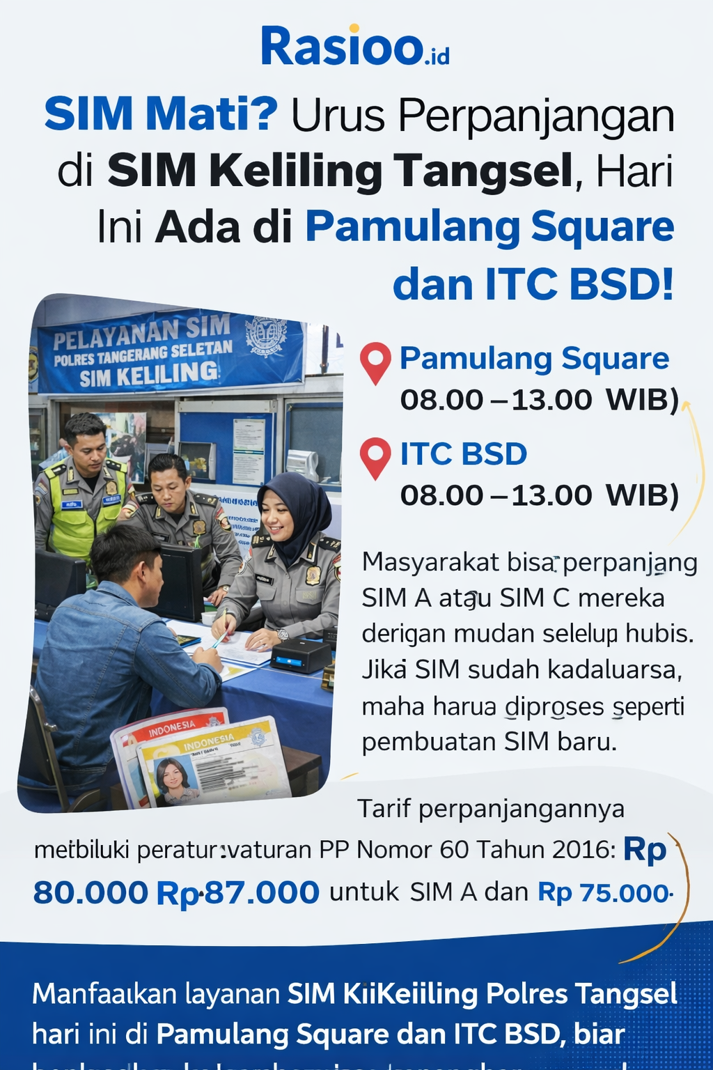 RASIOO.id – Warga yang ingin memperpanjang masa berlaku Surat Izin Mengemudi (SIM) kini punya opsi lebih mudah. Layanan SIM Keliling dari Polres Tangerang Selatan kembali hadir di sejumlah titik strategis hari ini.