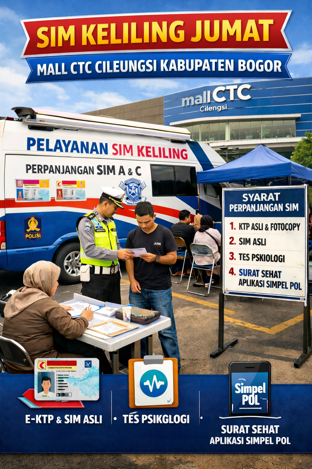RASIOO.ID – Pelayanan SIM Keliling kembali digelar untuk memudahkan masyarakat dalam memperpanjang masa berlaku Surat Izin Mengemudi (SIM). Pada hari Jumat, layanan ini berlokasi di Halaman Parkir Mall CTC Cilengsi, Kabupaten Bogor.