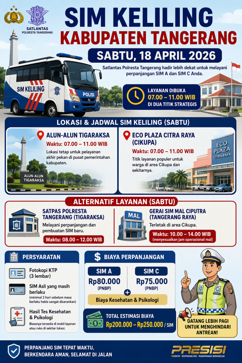 RASIOO.id – Layanan SIM Keliling di wilayah Kabupaten Tangerang kembali hadir pada Sabtu, 18 April 2026. Satlantas Polres Metro Tangerang menyiapkan dua titik layanan untuk memudahkan warga yang ingin melakukan perpanjangan SIM A dan SIM C.