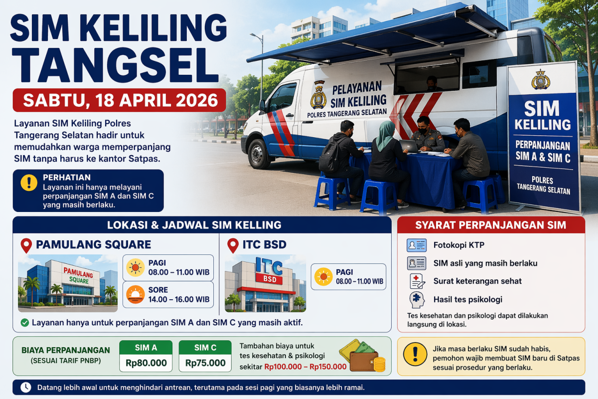 RASIOO.id – Layanan SIM Keliling di wilayah Tangerang Selatan kembali beroperasi untuk membantu warga yang ingin memperpanjang masa berlaku SIM tanpa harus ke kantor Satpas.