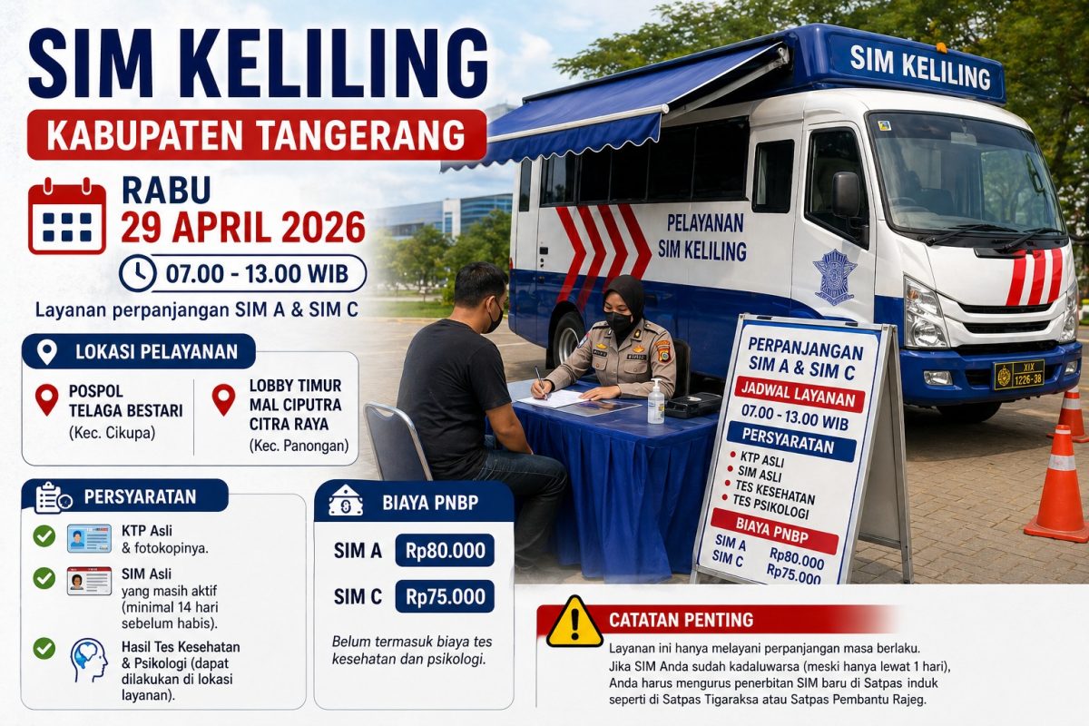 RASIOO.id – Layanan SIM Keliling di Kabupaten Tangerang kembali hadir pada Rabu, 29 April 2026. Pelayanan ini dikelola oleh Satlantas Polresta Tangerang dan dibuka mulai pukul 07.00 hingga 13.00 WIB.