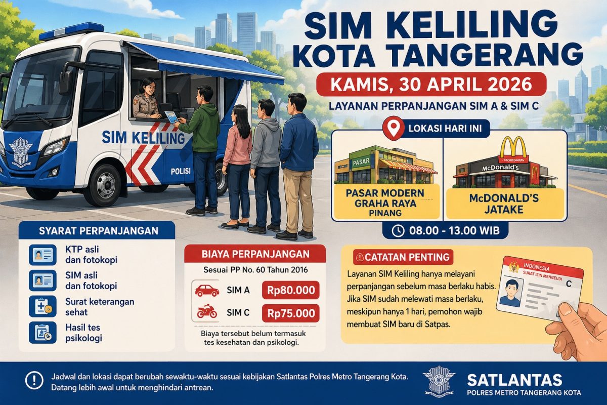 RASIOO.id – Layanan SIM Keliling di Kota Tangerang kembali hadir untuk mempermudah masyarakat dalam memperpanjang masa berlaku SIM tanpa harus ke kantor Satpas, Kamis, 30 April 2026.