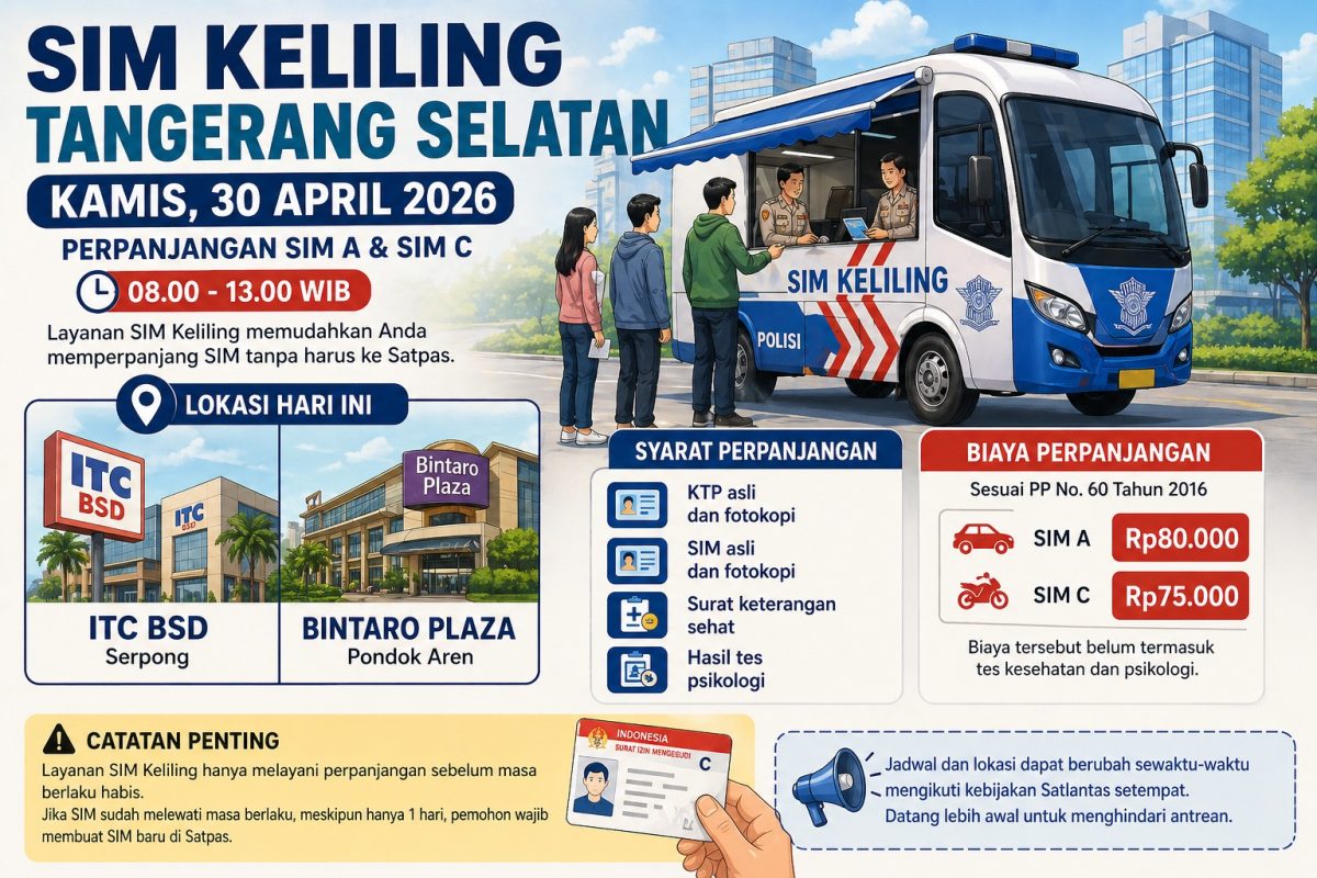 RASIOO.id – Layanan SIM Keliling di Kota Tangerang Selatan kembali beroperasi untuk mempermudah warga dalam memperpanjang masa berlaku SIM tanpa harus datang ke Satpas, Kamis, 30 April 2026.
